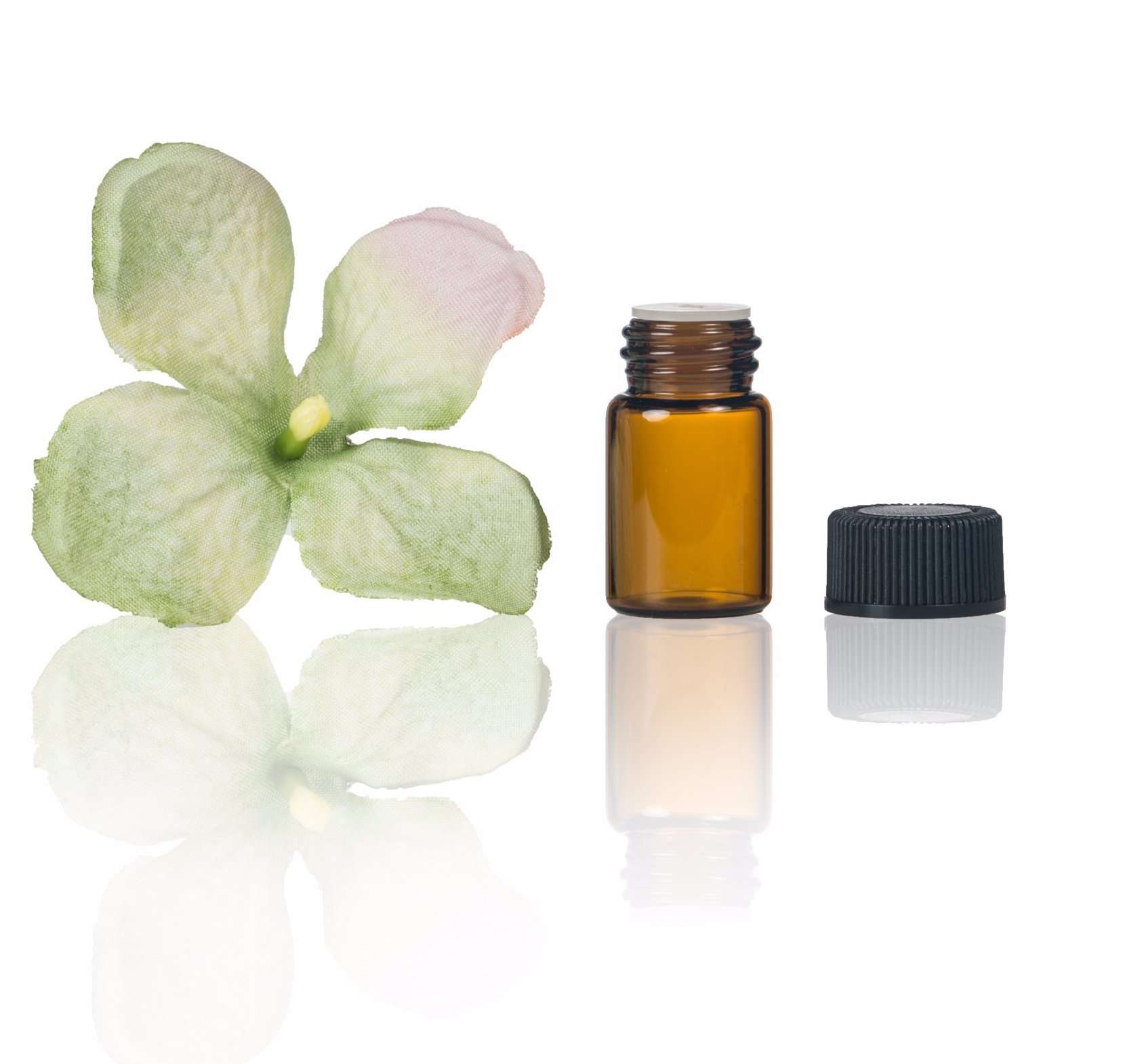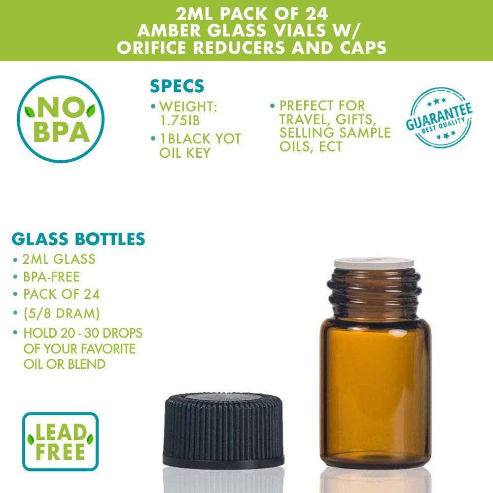 - Content: (24) Amber Glass Vials w/ (24) Orifice Reducers and Black Caps