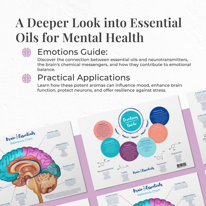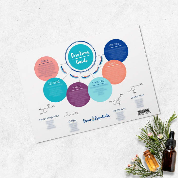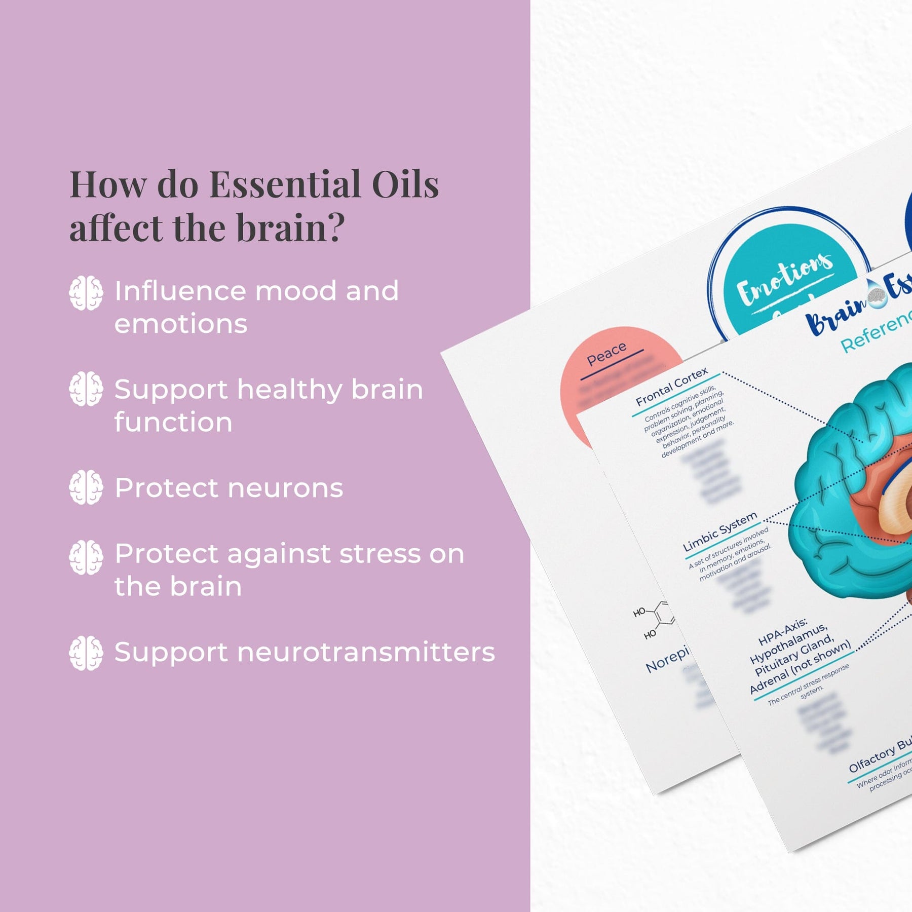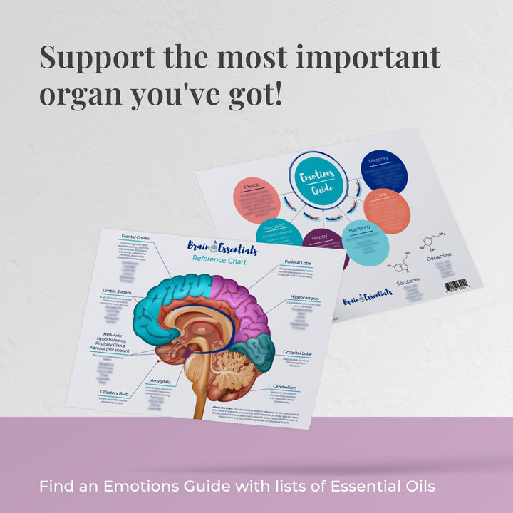 This chart provides lists of which oils are best for each part of the brain, while explaining the functions of the major parts of the brain. On the back side, you will find an Emotions Guide with lists of essential oils, as well as which oils are best to use for the main neurotransmitters associated with emotional wellness.