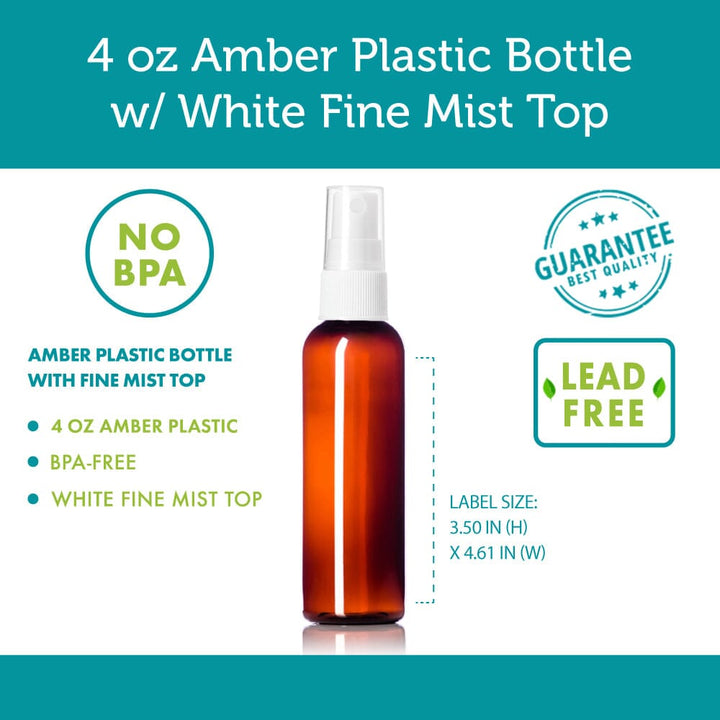 - Content: (1) Amber Plastic Bottle w/ (1) White Fine Mist Top and Clear Cap