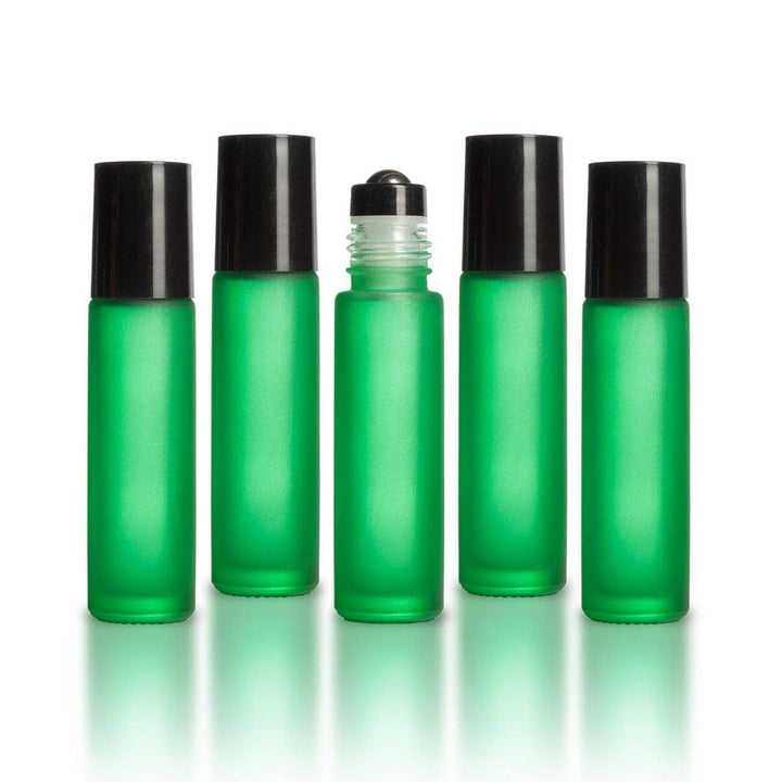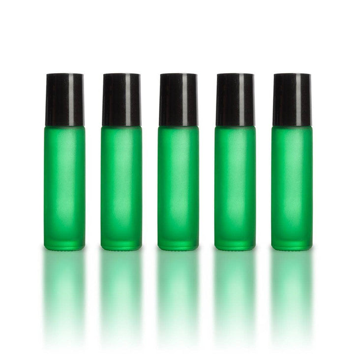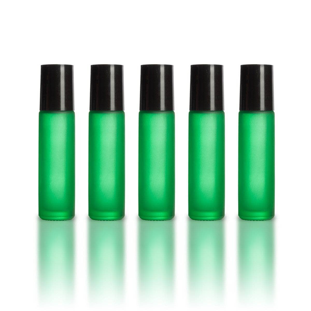 • Content:  (5) Green Frosted Glass Roller Bottles (5) Rollers and (5) Black Caps
