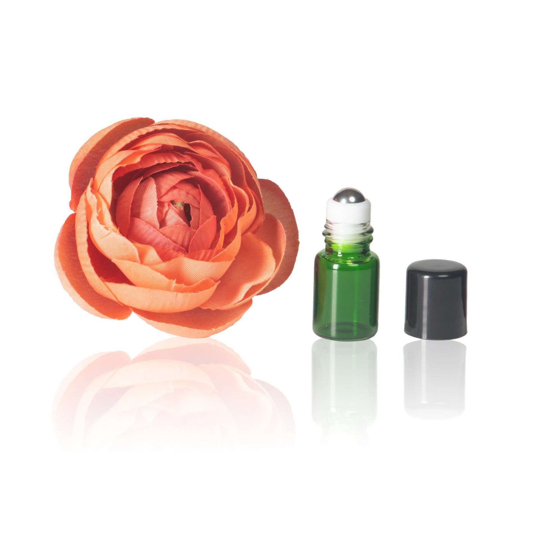 - Content: (5) Green Glass Vials w/ (5) Caps & Stainless Rollers